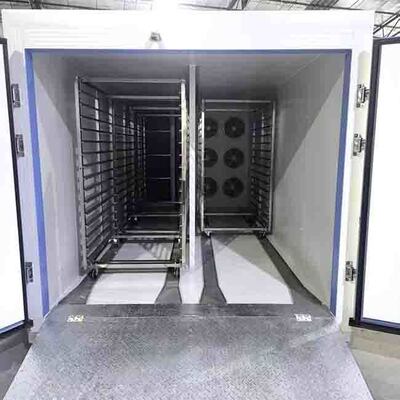 2.Conçu pour une déshydratation uniforme: disposant d'un système de circulation à haut volume alimenté par un groupe de 6 ventilateurs lourds générant 3000-4500 m3/h de flux d'air continu.Les canaux de sol aérodynamiques forcent l'air sec uniformément à travers les 180 plateaux simultanément, empêchant la formation de moisissures localisées ou le sous-séchage.
