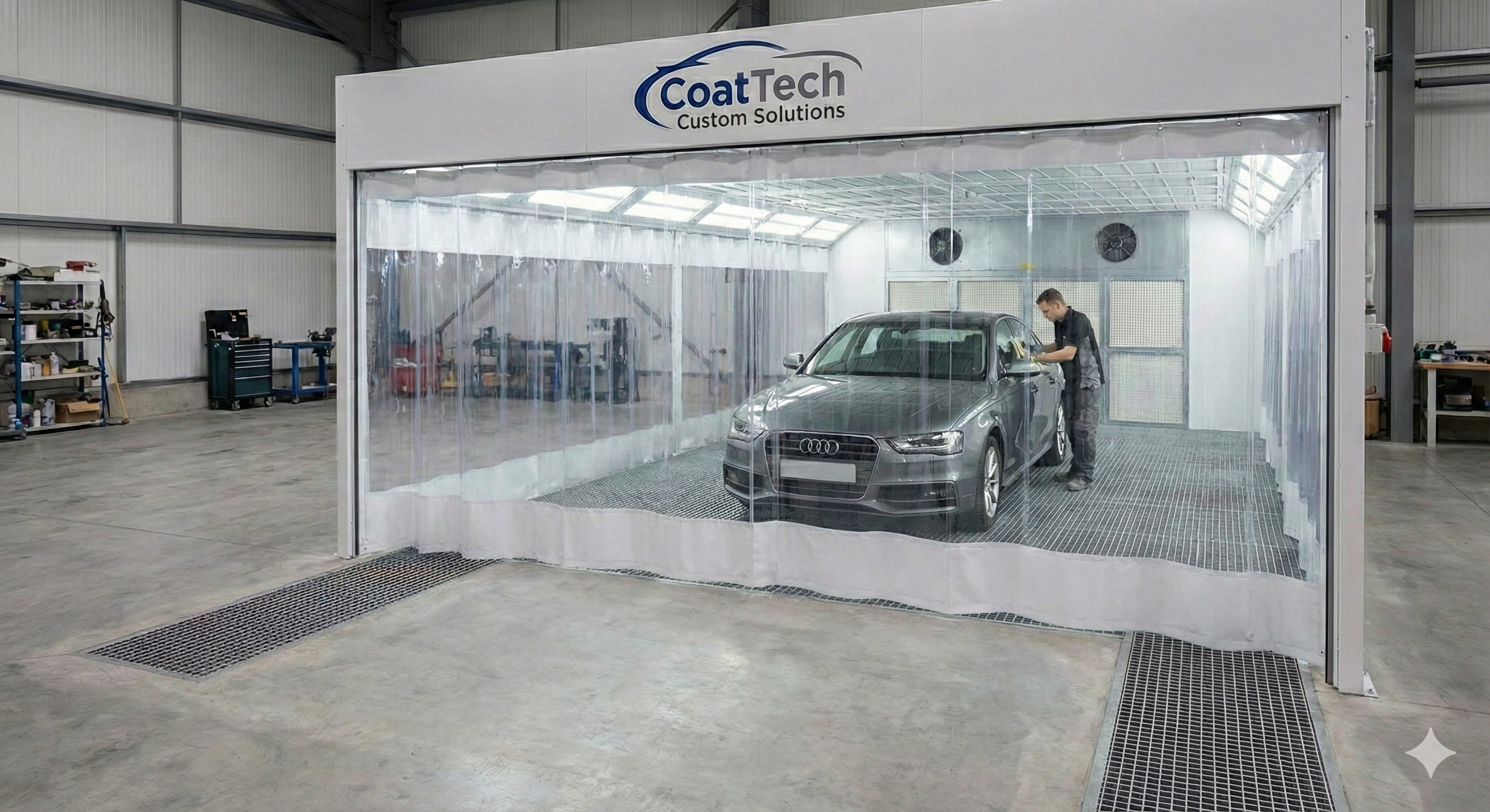 Encastrement de rideau en PVCContrairement à une cabine fixe, la station de préparation utilise des rideaux en PVC coulissants.