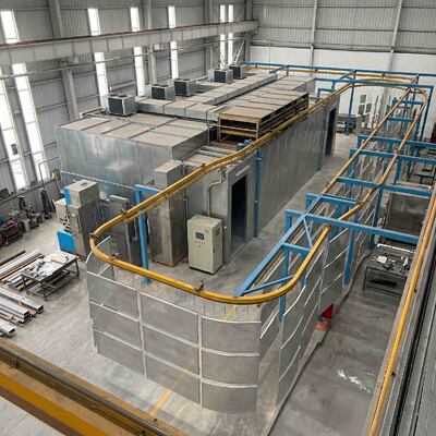 Système de manutention de matériaux aériens industriels qui guide les pièces métalliques à travers une installation de fabrication et de revêtement en poudre propre.